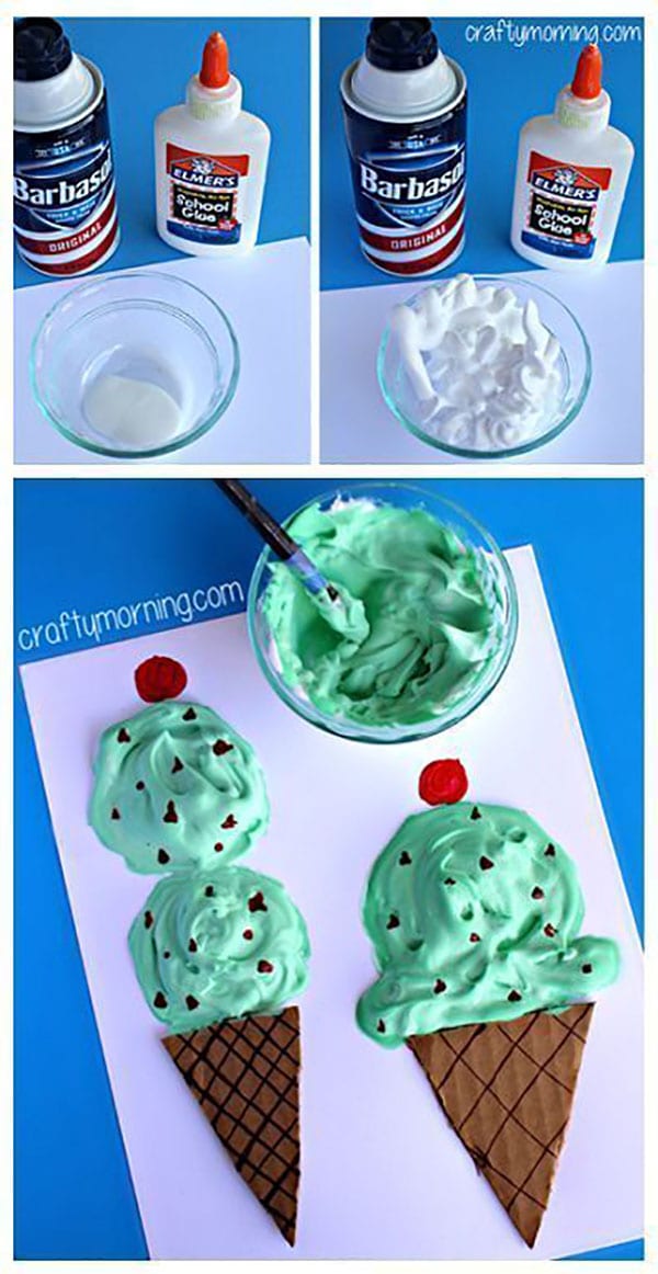 What five-year-old doesn’t love ice cream? Gather some cheap shaving cream, glue, and paint, and you’ve got the ingredients to make some delicious-looking ice cream.